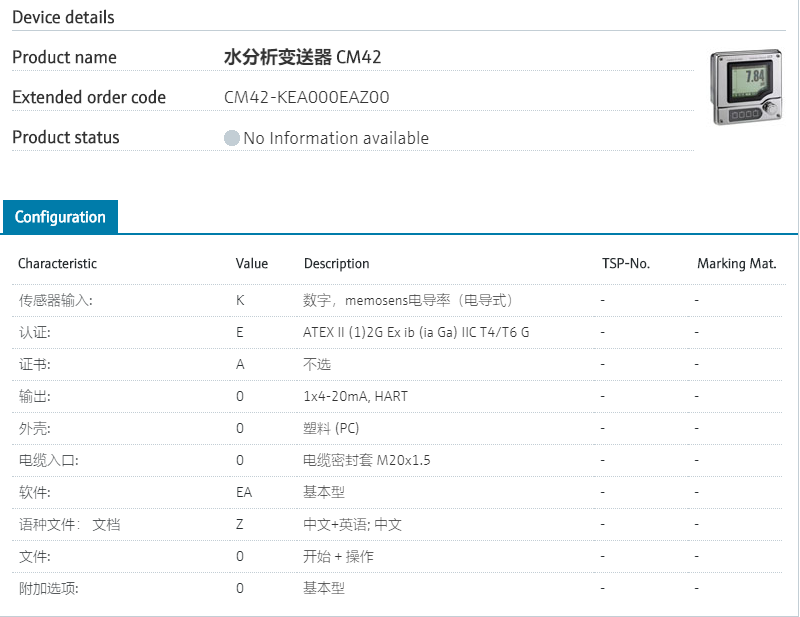 :: Functionality easily changeable传感器输入: K 数字,memosens电导率(电导式) 认证: E ATEX II (1)2G Ex ib (ia Ga) IIC T4/T6 G 证书: A 不选 输出: 0 1x4-20mA, HART 外壳: 0 塑料 (PC) 电缆入口: 0 电缆密封套 M20x1.5 软件: EA 基本型 语种文件: 文档 Z 中文+英语; 中文 文件: 0 开始 + 操作 附加选项: 0 基本型 型号参数
