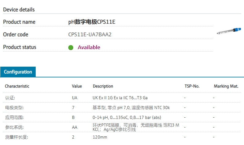 and environmental.认证: UA UK Ex II 1G Ex ia IIC T6...T3 Ga 电极类型: 7 基本型, 零点 pH 7,0, 温度传感器 NTC 30k 应用范围: B 0-14 pH, 0...135oC, 0,8...17 bar (abs) 参比系统: AA 环状PTFE隔膜,可消毒,无细胞毒性 饱和3 M KCl,;Ag/AgCl参比引线 测量杆长度: 2 120mm