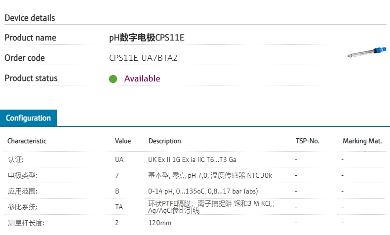 and environmental.认证: UA UK Ex II 1G Ex ia IIC T6...T3 Ga 电极类型: 7 基本型, 零点 pH 7,0, 温度传感器 NTC 30k 应用范围: B 0-14 pH, 0...135oC, 0,8...17 bar (abs) 参比系统: TA 环状PTFE隔膜;离子捕捉阱 饱和3 M KCl,;Ag/AgCl参比引线 测量杆长度: 2 120mm