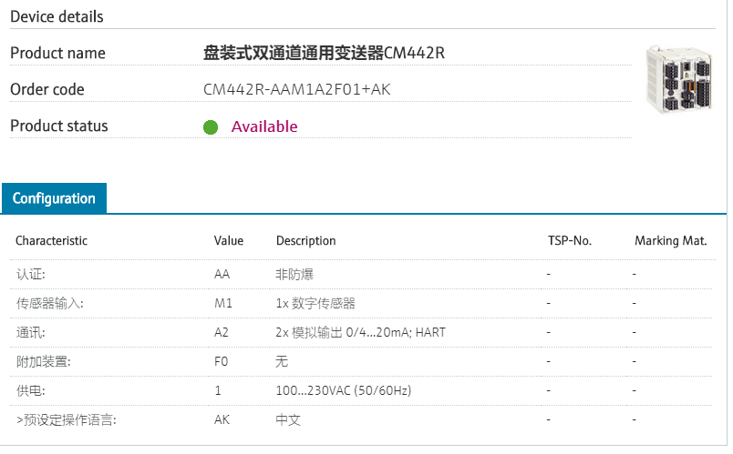 CM442R-AAM1A2F01+AK 订货号 CM442R-1MC7/0 扩展订货号 (CM442R-AAM1A2F01+AK) 名称 盘装式双通道通用变送器CM442R 基本描述 Transmitter liquid analysis