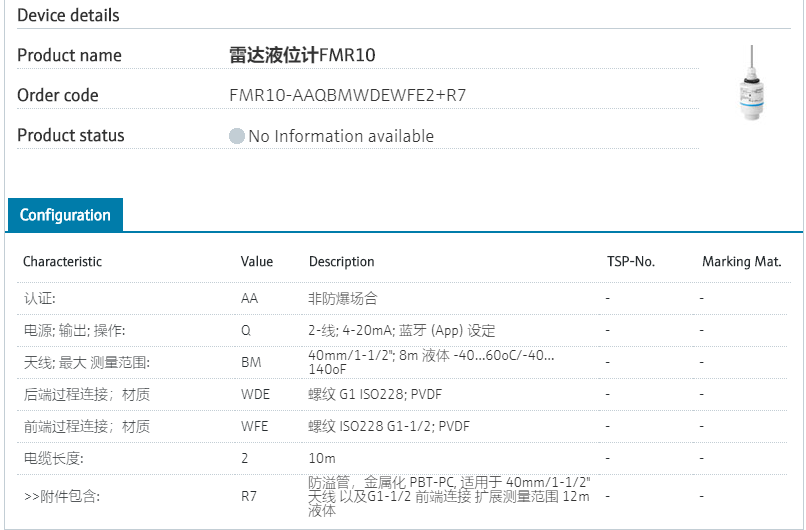无线调试认证: AA 非防爆场合 电源; 输出; 操作: Q 2-线; 4-20mA; 蓝牙 (App) 设定 天线; 最大 测量范围: BM 40mm/1-1/2"; 8m 液体 -40…60oC/-40…140oF 后端过程连接;材质 WDE 螺纹 G1 ISO228; PVDF 前端过程连接;材质 WFE 螺纹 ISO228 G1-1/2; PVDF 电缆长度: 2 10m >>附件包含: R7 防溢管,金属化 PBT-PC, 适用于 40mm/1-1/2" 天线 以及G1-1/2 前端连接 扩展测量范围 12m 液体 型号参数