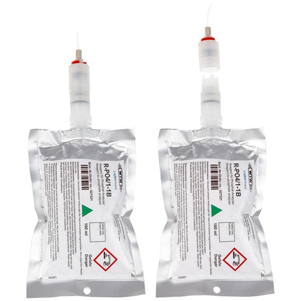 Reagent set for PO4 measuring range 1 (0.02 … 15.00 mg/L PO4-P) consists of reagent 1A, 1B for the analyzer Alyza IQ