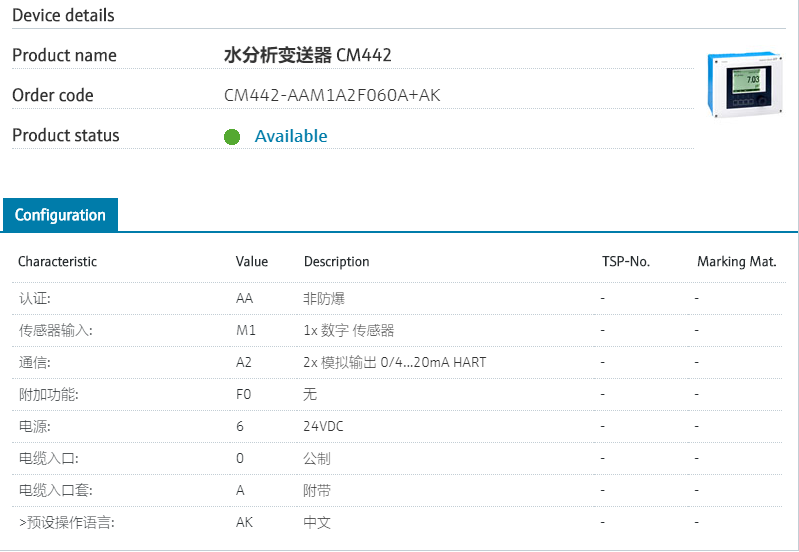 :: Easily expandable at any time认证: AA 非防爆 传感器输入: M1 1x 数字 传感器 通信: A2 2x 模拟输出 0/4...20mA HART 附加功能: F0 无 电源: 6 24VDC 电缆入口: 0 公制 电缆入口套: A 附带 >预设操作语言: AK 中文 型号参数