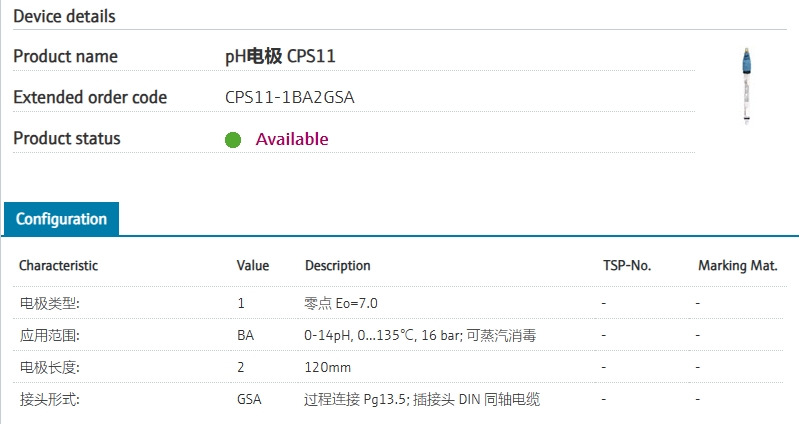 CPS11-1BA2GSA 订货号 CPS11-1BA2GSA 扩展订货号 pH电极 CPS11 基本描述 pH comb. electrode