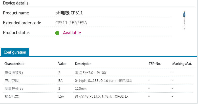 CPS11-2BA2ESA 订货号 CPS11-2BA2ESA 扩展订货号 pH电极 CPS11 基本描述 pH comb. electrode