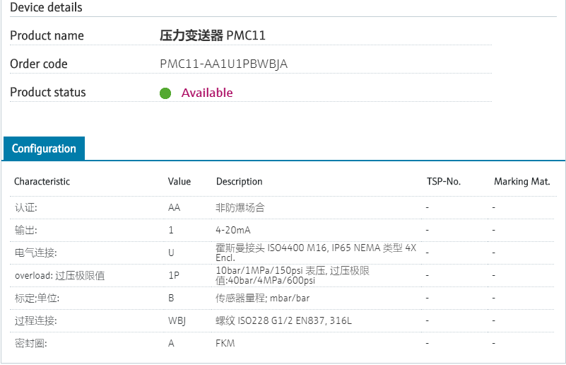 ::长期稳定性高+抗过载能力强认证: AA 非防爆场合 输出: 1 4-20mA 电气连接: U 霍斯曼接头 ISO4400 M16, IP65 NEMA 类型 4X Encl. overload: 过压极限值 1P 10bar/1MPa/150psi 表压, 过压极限值:40bar/4MPa/600psi 标定;单位: B 传感器量程; mbar/bar 过程连接: WBJ 螺纹 ISO228 G1/2 EN837, 316L 密封圈: A FKM