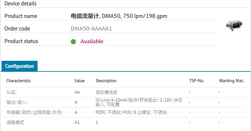 secure Bluetooth connection.防爆认证: AA 非防爆场合 输出; 输入: A IO-Link/4-20mA/脉冲/开关输出/ 2-10V; 状态 输入, 可配置 传感器; 密封; 过程连接; 外壳: A PEEK, 不锈钢; FKM; G 公螺纹 不锈钢 设备模式 A1 1 产品型号