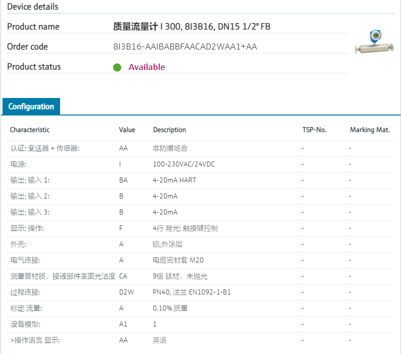 compact, easily accessible transmitter.认证; 变送器 + 传感器: AA 非防爆场合 电源: I 100-230VAC/24VDC 输出; 输入 1: BA 4-20mA HART 输出; 输入 2: B 4-20mA 输出; 输入 3: B 4-20mA 显示; 操作: F 4行 背光; 触摸键控制 外壳: A 铝外壳, 带防腐涂层 电气连接: A 电缆密封套 M20 测量管材质,接液部件表面光洁度 CA 9级 钛材 过程连接: D2W PN40, 法兰 EN1092-1-B1 标定 流量: A 0.10% 质量 设备模型: A1 1 >操作语言 显示: AA 英语 产品型号