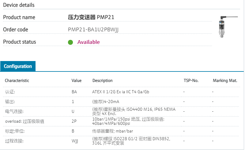 PMP21-BA1U2PBWJJ 订货号 PMP21-4H03/0 扩展订货号 (PMP21-BA1U2PBWJJ 名称 压力变送器 PMP21 基本描述 压力, 压阻式