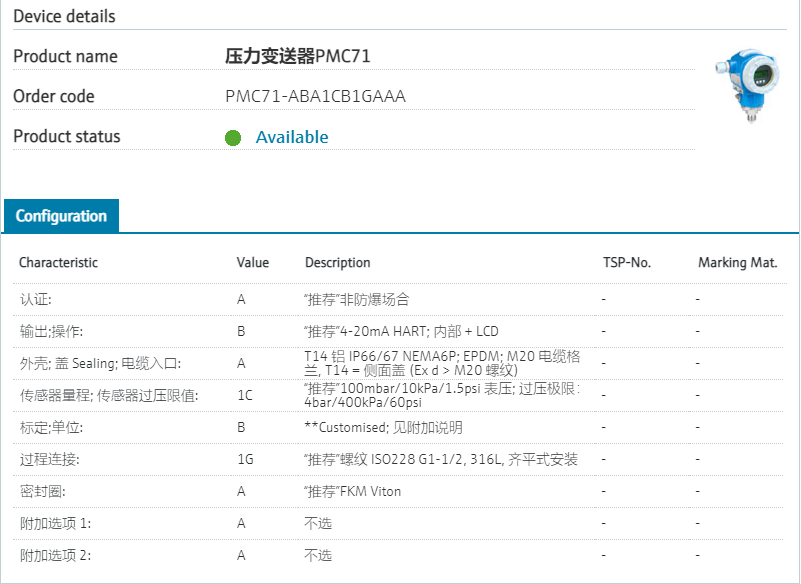 :: Modular.认证: A “推荐”非防爆场合 输出;操作: B “推荐”4-20mA HART; 内部 + LCD 外壳; 盖 Sealing; 电缆入口: A T14 铝 IP66/67 NEMA6P; EPDM; M20 电缆格兰, T14 = 侧面盖 (Ex d > M20 螺纹) 传感器量程; 传感器过压限值: 1C “推荐”100mbar/10kPa/1.5psi 表压; 过压极限:4bar/400kPa/60psi 标定;单位: B B**Customised; 见附加说明 过程连接: 1G “推荐”螺纹 ISO228 G1-1/2, 316L, 齐平式安装 密封圈: A 推荐”FKM Viton 附加选项 1: A 不选 附加选项 2: A 不选 型号参数