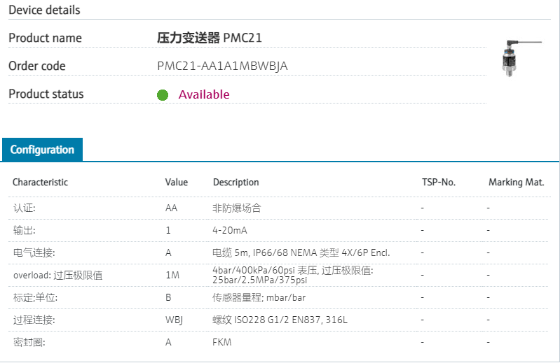 ::长期稳定性高+抗过载能力强认证: AA 非防爆场合 输出: 1 4-20mA 电气连接: A 电缆 5m, IP66/68 NEMA 类型 4X/6P Encl. overload: 过压极限值 1M 4bar/400kPa/60psi 表压, 过压极限值: 25bar/2.5MPa/375psi 标定;单位: B 传感器量程; mbar/bar 过程连接: WBJ 螺纹 ISO228 G1/2 EN837, 316L 密封圈: A FKM 型号参数