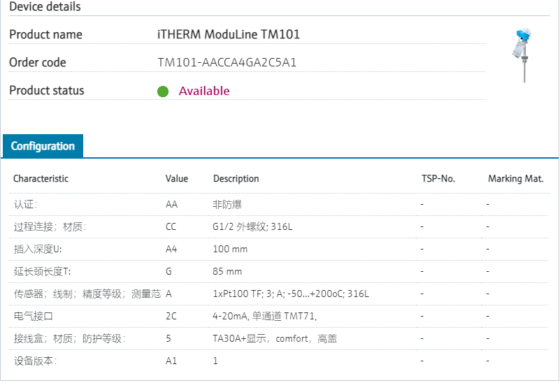 316L, Alloy600.认证: AA 非防爆 过程连接;材质: CC G1/2 外螺纹; 316L 插入深度U: A4 100 mm 延长颈长度T: G 85 mm 传感器;线制;精度等级;测量范围;材质: A 1xPt100 薄膜式; 3-线; A; -50...+200oC; 316L 电气接口 2C 4-20mA, 单通道 TMT71, 模块变送器DIN B 接线盒;材质;防护等级: 5 TA30A,带显示,标准型表盖带铰链;铸铝;IP66/68 设备版本: A1 1