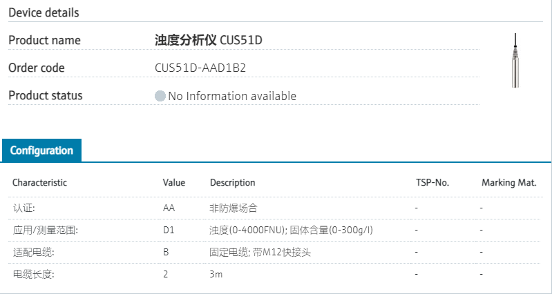 Factory calibration认证: AA 非防爆场合 应用/测量范围: D1 浊度(0-4000FNU); 固体含量(0-300g/l) 适配电缆: B 固定电缆; 带M12快接头 电缆长度: 2 3m 型号参数