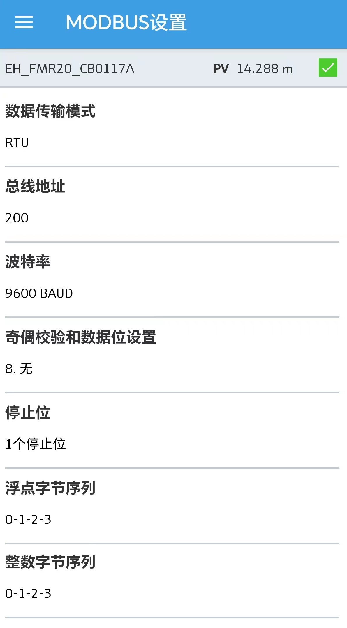 8.然后根据图中所示的参数进行设置,就能看到FMR20中连接RS485的数据了。跟在Smartblue里基本设置中的数据一致。