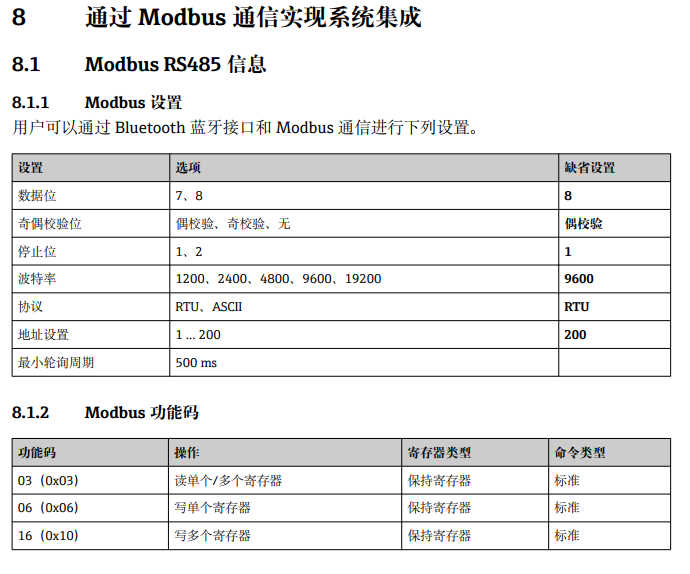 4.Modbus RS485信息,可以在8.1.2中看到寄存器类型均为保持寄存器。