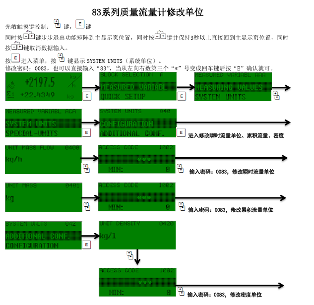 83系列的质量流量计快速设置语言、单位、电流输出、脉冲输出光敏触摸键控制:“+,-”键,“E”键。同时按“+,-”键一步步退出功能矩阵到主显示页位置,同时按“+,-”键并保持3秒以上直接回到主显示页位置,同时按“+,-”键取消数据输入。按“E”进入菜单,再按+/-键找到 OUICKSETUP(快速设置)。修改密码:0083,也可以直接输入“83”,当从左向右数第三个“*"号变成回车键后按“E”确认就可。