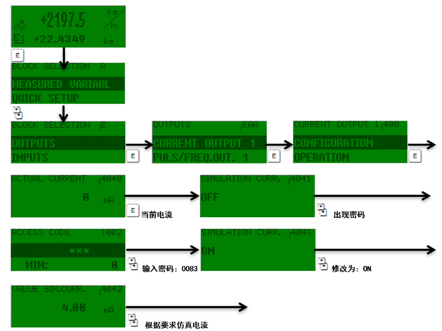 83系列的质量流量计快速设置语言、单位、电流输出、脉冲输出光敏触摸键控制:“+,-”键,“E”键。同时按“+,-”键一步步退出功能矩阵到主显示页位置,同时按“+,-”键并保持3秒以上直接回到主显示页位置,同时按“+,-”键取消数据输入。按“E”进入菜单,再按+/-键找到 OUTPUTS (输出)。修改密码:0083,也可以直接输入“83”,当从左向右数第三个“*"号变成回车键后按“E”确认就可。