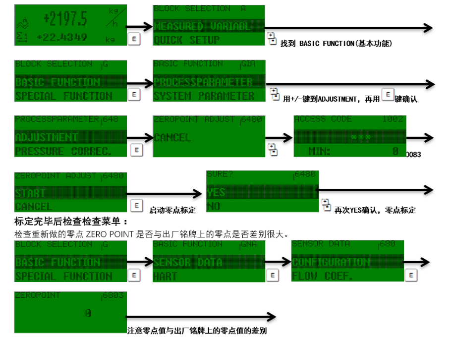 注意:在进行零点修正前将小流量切除值改为零,这样当零点修正完成后可以看到零点波动的情况,然后再将小流量切除加上。小流量切除值查看小流量切除功能菜单表格。