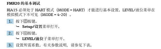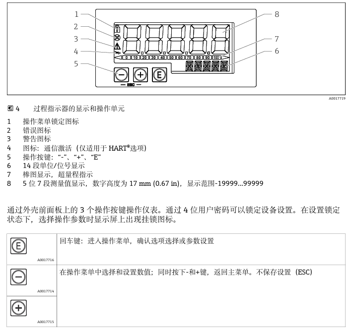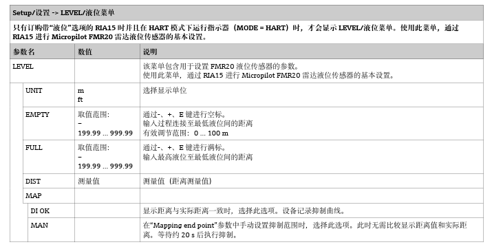 1.测量原理:RIA15 回路显示仪安装在4 - 20 mA或HART®信号回路中,数字式传输测量信号或HART®过程变 量。回路显示仪无需外接电源,直接由回路供电。设备符合HART®通信协议要求,可以HART®5.0及其以上版本的设备配套使用。 液晶显示屏能够显示5位数字可扩展测量值,即使在强光照条件下用户也能轻松进行读数。除了 显示测量值,还可通过三个按键轻松实现单位和棒图显示。可以按需选择带背光显示功能的设备。但是,电压降将增大。RIA15 可以与指定型号的 E+H传感器或变送器配套使用,不仅可以显示测量值,还可以执行传感器设置。但是,此时必须在订购选项中选择选项“Level”或“Analysis”。