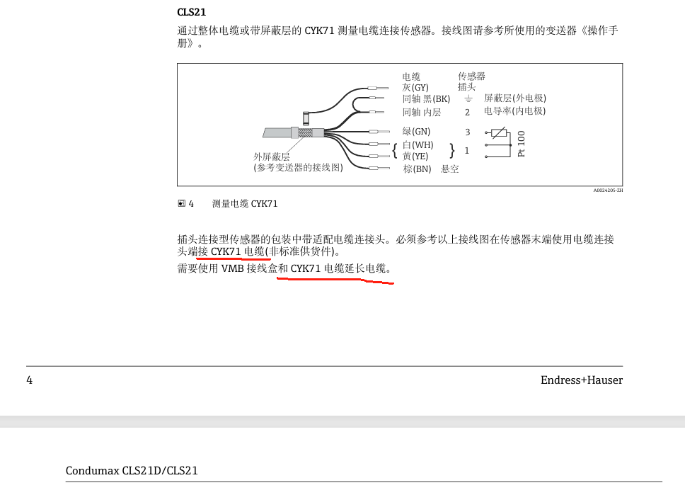 网站首页    技术支持    安装接线    E+H CYK71 电缆主要用于连接电导率测量相关的电极,常见适配的电极型号有 CLS12、CLS13、CLS15、CLS16、CLS19、CLS21。