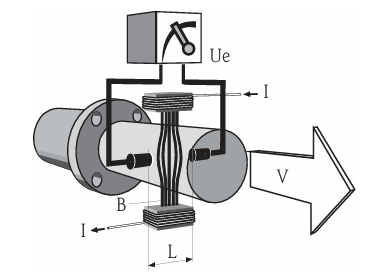 根据法拉第电磁感应定律,导体在磁场中运动时,会产生感应电压。 在电磁测量原理中,流动的介质相当于运动的导体。 感应电压与介质流速成比例关系,通过两个测量电极加载在放大器上。基于管道横截面积计算体 积流量。 极性交替变化的开关直流电产生直流(DC)磁场。其是通过电磁场来进行测量,管道内没有液体通过了,但是磁场还在就会有读数。下面是其原理示意图,