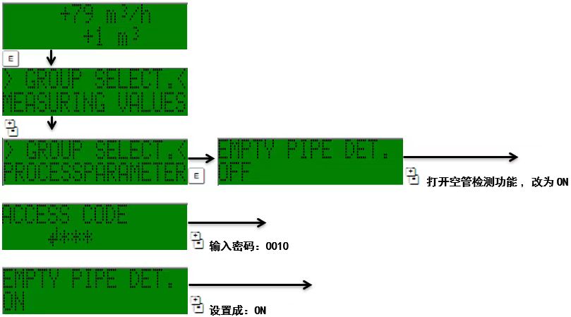 打开空管检测,首先进入组选择,选择起其中的测量值,然后选择过程参数,打开空管检测功能,输入访问秘密,访问密码为10,然后将OFF改为ON即可,空管检测就打开了。如图所示