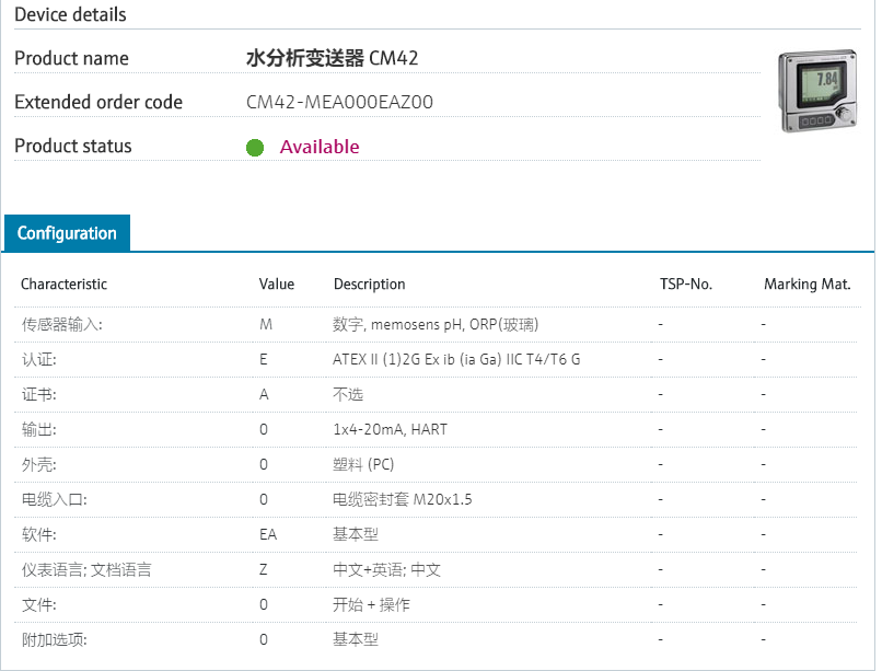 :: Functionality easily changeable传感器输入: M 数字, memosens pH, ORP(玻璃) 认证: E ATEX II (1)2G Ex ib (ia Ga) IIC T4/T6 G 证书: A 不选 输出: 0 1x4-20mA, HART 外壳: 0 塑料 (PC) 电缆入口: 0 电缆密封套 M20x1.5 软件: EA 基本型 语种文件: 文档 Z 中文+英语; 中文 文件: 0 开始 + 操作 附加选项: 0 基本型 型号参数