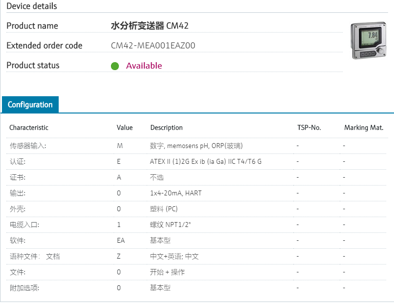 :: Functionality easily changeable传感器输入: M 数字, memosens pH, ORP(玻璃) 认证: E ATEX II (1)2G Ex ib (ia Ga) IIC T4/T6 G 证书: A 不选 输出: 0 1x4-20mA, HART 外壳: 0 塑料 (PC) 电缆入口: 1 螺纹 NPT1/2" 软件: EA 基本型 语种文件: 文档 Z 中文+英语; 中文 文件: 0 开始 + 操作 附加选项: 0 基本型 型号参数