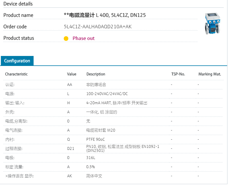 5L4C1Z-AALHA0AQD210A+AK 订货号 5L4C1Z-1WH7/0 扩展订货号 (5L4C1Z-AALHA0AQD210A+AK) 名称 电磁流量计 L400,5L4C1Z,DN125 防爆认证: AA 非防爆场合 电源: L 100-240VAC/24VAC/DC 输出; 输入: H 4-20mA HART, 脉冲/频率 开关输出 外壳: A 一体型, 铝外壳, 带防腐涂层 分体型电缆: 0 无 电气连接: A 电缆密封套 M20 内衬: Q PTFE 90oC 过程连接: D21 PN10, 碳钢, 松套法兰 成型钢板 EN1092-1 电极: 0 316L 标定 流量: A 0.5% >操作语言 显示: AK 简体中文 型号参数