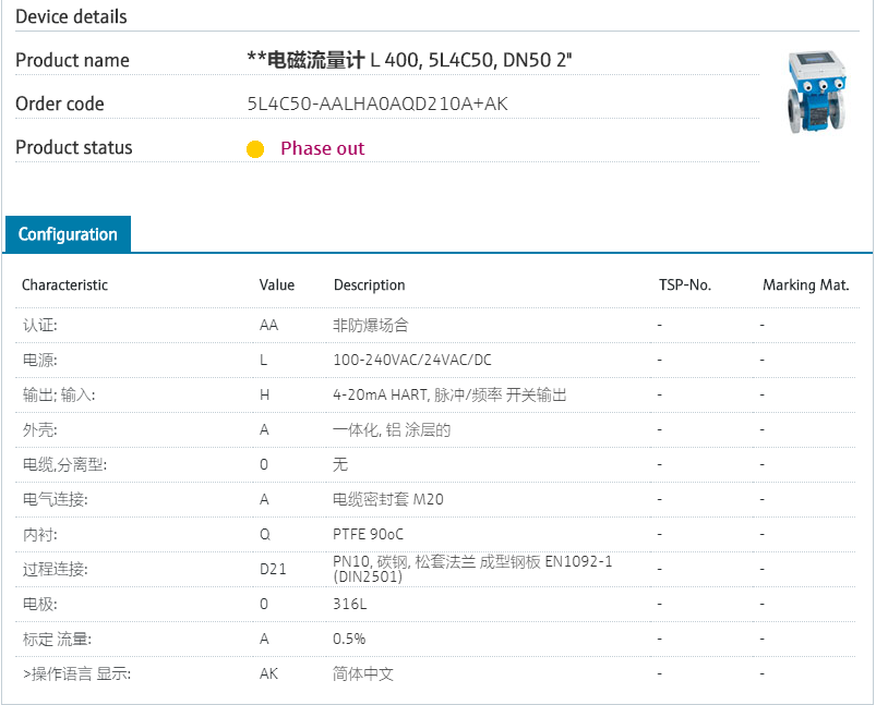 5L4C50-AALHA0AQD210A+AK 订货号 5L4C50-2196/0 扩展订货号 (5L4C50-AALHA0AQD210A+AK) 名称 电磁流量计 L400,5L4C50,DN50 2" 防爆认证: AA 非防爆场合 电源: L 100-240VAC/24VAC/DC 输出; 输入: H 4-20mA HART, 脉冲/频率 开关输出 外壳: A 一体型, 铝外壳, 带防腐涂层 分体型电缆: 0 无 电气连接: A 电缆密封套 M20 内衬: Q PTFE 90oC 过程连接: D21 PN10, 碳钢, 松套法兰 成型钢板 EN1092-1 电极: 0 316L 标定 流量: A 0.5% >操作语言 显示: AK 简体中文 型号参数