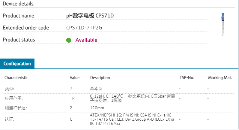 CPS71D-7TP2G 扩展订货号 CPS71D-7TP2G 名称 ***pH数字电极 CPS71D 基本描述 pH comb. electrode,