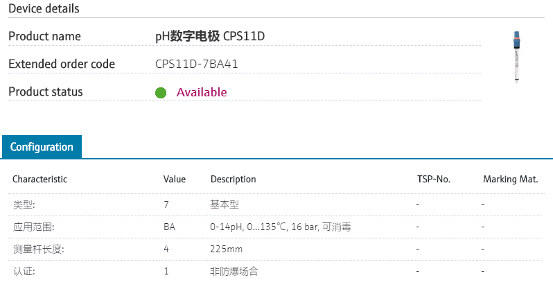 Temeratur sensor integrated.类型: 7 基本型 应用范围: BA 0-14pH, 0...135℃, 16 bar, 可消毒 测量杆长度: 4 225mm 认证: 1 非防爆场合 型号参数