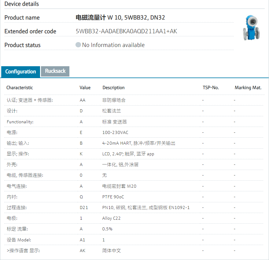 with easy-to-use operation concept.认证; 变送器 + 传感器: AA 非防爆场合 设计: E 固定的 法兰 功能: A 标准变送器 电源: E 100-230VAC 输出; 输入: B 4-20mA HART, 脉冲/频率/开关输出 显示; 操作: K LCD, 2.40"; 触屏, 蓝牙 app 外壳: A 一体化, 铝,外涂层 电缆, 传感器连接: 0 无 电气连接: A 电缆密封套 M20 内衬: E PTFE 130oC 过程连接: D5K PN40, 碳钢, 法兰 EN1092-1 电极: 1 Alloy C22 标定 流量: A 0.5% 设备版本: A1 1 >操作语言 显示: AK 简体中文