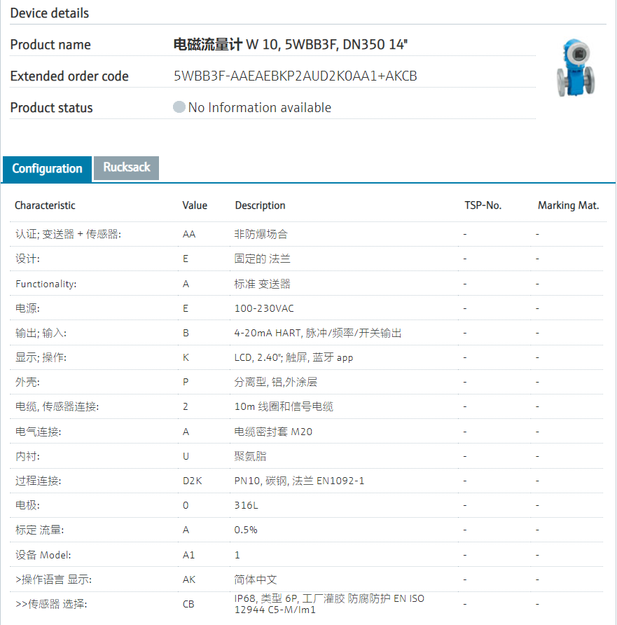 with easy-to-use operation concept.认证; 变送器 + 传感器: AA 非防爆场合 设计: E 固定的 法兰 功能: A 标准变送器 电源: E 100-230VAC 输出; 输入: B 4-20mA HART, 脉冲/频率/开关输出 显示; 操作: K LCD, 2.40"; 触屏, 蓝牙 app 外壳: P 分离型, 铝,外涂层 电缆, 传感器连接: 2 10m 线圈和信号电缆 电气连接: A 电缆密封套 M20 内衬: U 聚氨脂 过程连接: D2K PN10, 碳钢, 法兰 EN1092-1 电极: 0 316L 标定 流量: A 0.5% 设备版本: A1 1 >操作语言 显示: AK 简体中文 >>传感器 选择: CB IP68, 类型 6P, 工厂灌胶 防腐防护 EN ISO 12944 C5-M/Im1