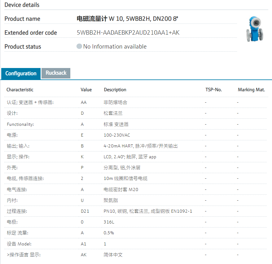 with easy-to-use operation concept.认证; 变送器 + 传感器: AA 非防爆场合 设计: D 松套法兰 功能: A 标准变送器 电源: E 100-230VAC 输出; 输入: B 4-20mA HART, 脉冲/频率/开关输出 显示; 操作: K LCD, 2.40"; 触屏, 蓝牙 app 外壳: P 分离型, 铝,外涂层 电缆, 传感器连接: 2 0m 线圈和信号电缆 电气连接: A 电缆密封套 M20 内衬: U 聚氨脂 过程连接: D21 PN10, 碳钢, 松套法兰, 成型钢板 EN1092-1 电极: 0 316L 标定 流量: A 0.5% 设备版本: A1 1 >操作语言 显示: AK 简体中文