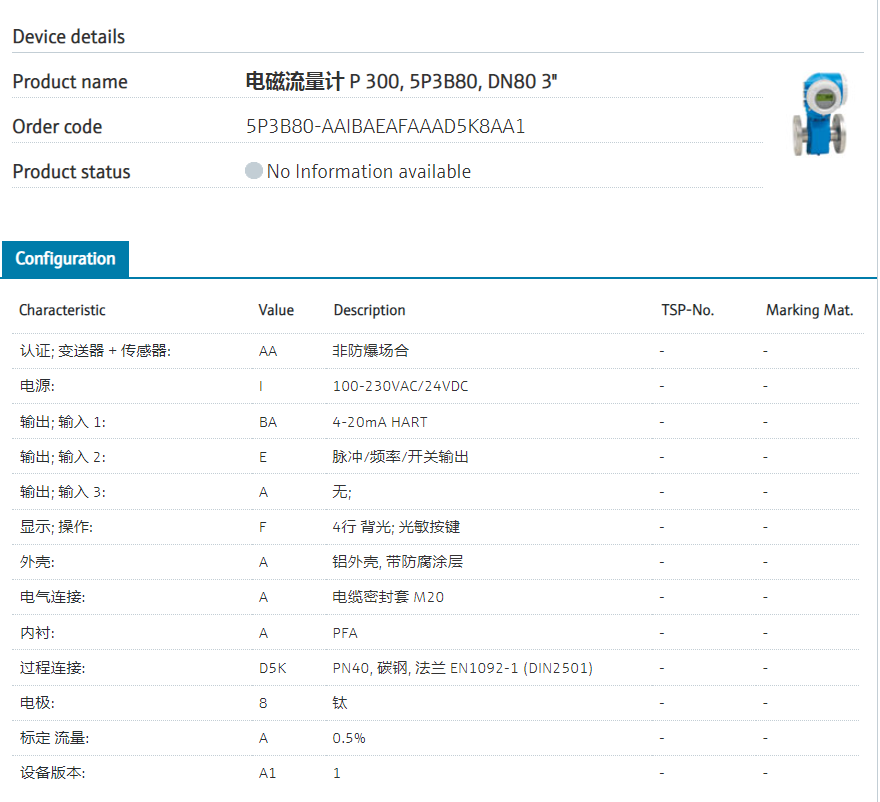 5P3B80-AAIBAEAFAAAD5K8AA1 订货号 5P3B80-16P19/0 扩展订货号 (5P3B80-AAIBAEAFAAAD5K8AA1) 名称 电磁流量计 P 300, 5P3B80, DN80 3" 基本描述 Electromagnetic flowmeter
