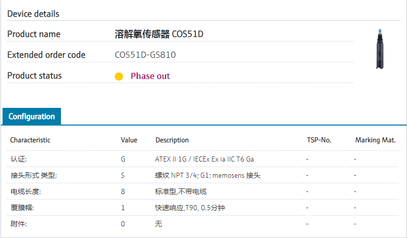 COS51D-GS810 扩展订货号 COS51D-GS810 名称 ***溶解氧传感器 COS51D 基本描述 Dissolved oxygen Sensor, amperometrical