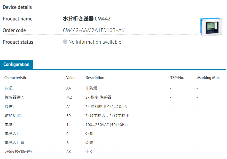:: Easily expandable at any time认证: AA 非防爆 传感器输入: M2 2x 数字 传感器 通信: A1 2x 模拟输出 0/4...20mA 附加功能: FD 2x数字输入,2x数字输出 电源: 1 100...230VAC (50/60Hz) 电缆入口: 0 公制 电缆入口套: B 安装 >预设操作语言: AK 中文