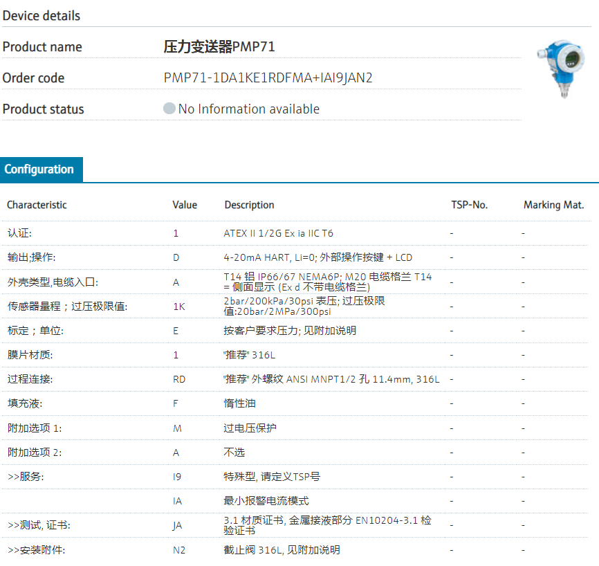 :: Modular.认证: 1 ATEX II 1/2G Ex ia IIC T6 输出;操作: D 4-20mA HART, Li=0; 外部操作按键 + LCD 外壳类型,电缆入口: A T14 铝 IP66/67 NEMA6P; M20 电缆格兰 T14 = 侧面显示 (Ex d 不带电缆格兰) 传感器量程;过压极限值: 1K 2bar/200kPa/30psi 表压; 过压极限值:20bar/2MPa/300psi 标定;单位: E 按客户要求压力; 见附加说明 膜片材质: 1 "推荐" 316L 过程连接: RD "推荐" 外螺纹 ANSI MNPT1/2 孔 11.4mm, 316L 填充液: F 惰性油 附加选项 1: M 过电压保护 附加选项 2: A 不选