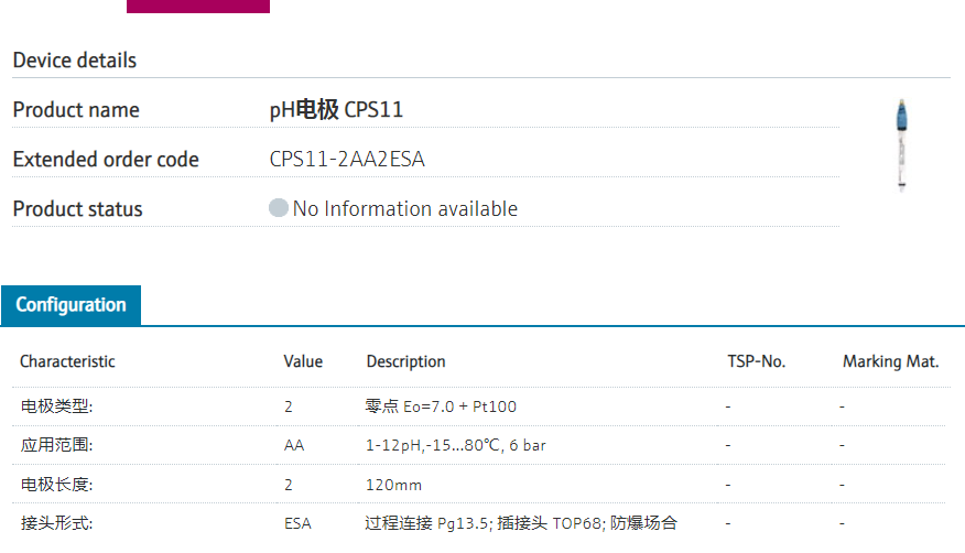 CPS11-2AA2ESA 订货号 CPS11-2AA2ESA 扩展订货号 pH电极 CPS11 基本描述 pH comb. electrode