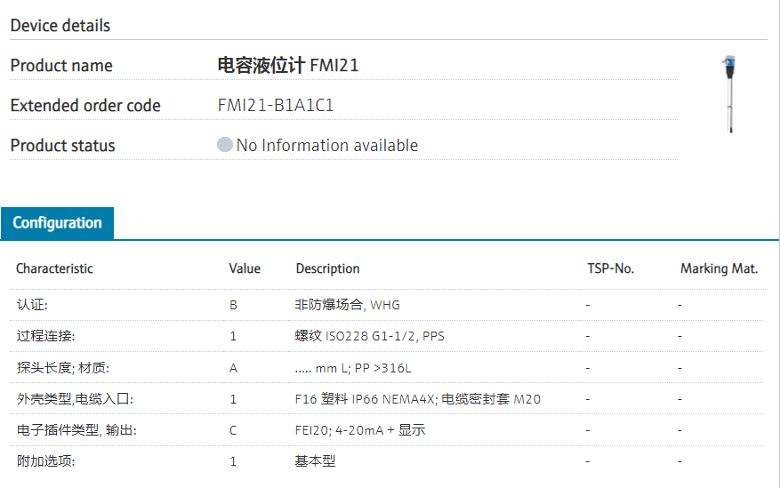 ::耐腐蚀材质认证: B 非防爆场合, WHG 过程连接: 1 螺纹 ISO228 G1-1/2, PPS 探头长度; 材质: A ..... mm L; PP >316L 外壳类型,电缆入口: 1 F16 塑料 IP66 NEMA4X; 电缆密封套 M20 电子插件类型, 输出: C FEI20; 4-20mA + 显示 附加选项: 1 基本型