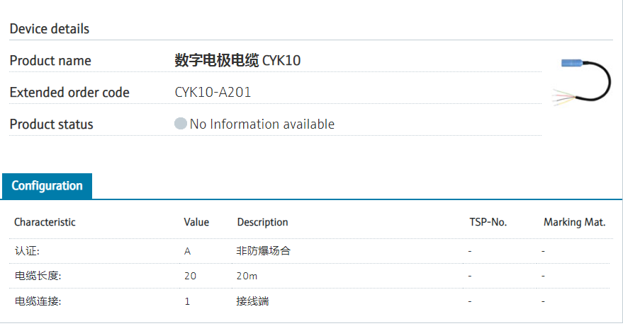 E+H数字电极电缆,适合所有带memosens接口的电极,支持PH/ORP, 电导率,溶解氧,浊度,余氯.....,阿仪常备大量5米,10米的现货,价格优惠,欢迎采购 CYK10-A031 电缆长度3米 CYK10-A051 电缆长度5米 CYK10-A101 电缆长度10米 CYK10-A151 电缆长度15米 CYK10-A201 电缆长度20米