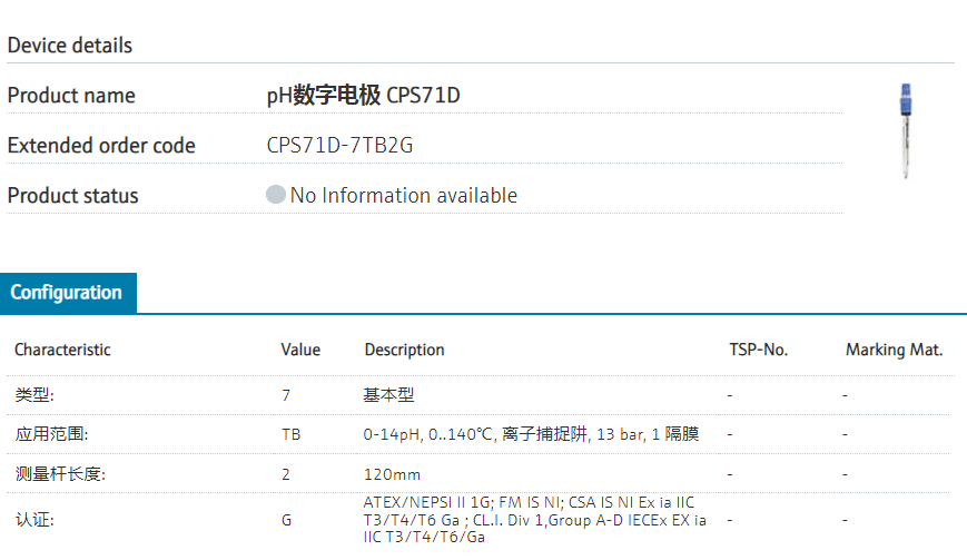 CPS11D-7BT21 0-14pH, 0-135℃, 16 bar; 离子捕捉阱,主要用于化工场合。防爆的型号为CPS11D-7BT2G, 已经进入退市阶段,新款是 CPS11E-AA7BTA2 | CPS11E-10K6/0