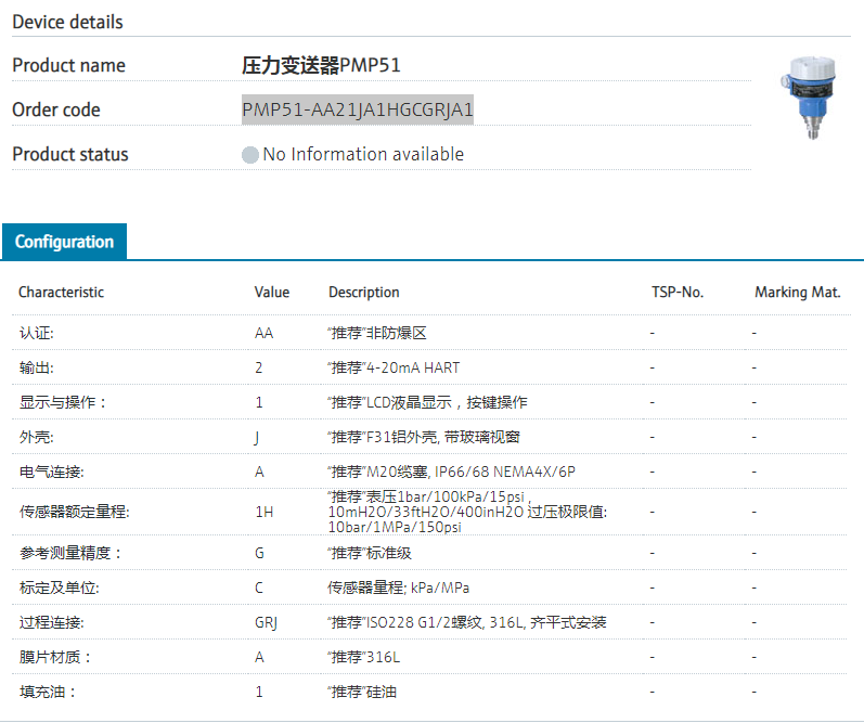 PMP51-AA21JA1HGCGRJA1 订货号 PMP51-5N12/0 扩展订货号 (PMP51-AA21JA1HGCGRJA1 ) 名称 压力变送器PMP51 基本描述 Measurement: Pressure, piezoresistive.