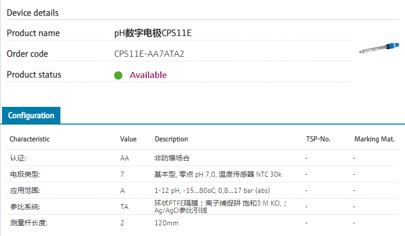 CPS11E-AA7ATA2 订货号 CPS11E--10C2/0 扩展订货号 (CPS11E-AA7ATA2) 名称 pH数字电极CPS11E 基本描述 pH glass comb. sensor, Memosens 2.0.
