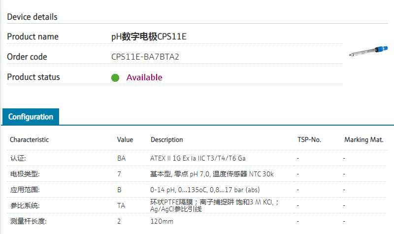 CPS11E-BA7BTA2 订货号 CPS11E--10Q9/0 扩展订货号 (CPS11E-BA7BTA2) 名称 pH数字电极CPS11E 基本描述 pH glass comb. sensor, Memosens 2.0.