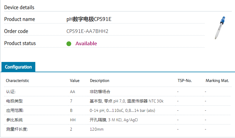 CPS91E-AA7BHH2 订货号 CPS91E--1020/0 扩展订货号 (CPS91E-AA7BHH2 ) 名称 pH数字电极CPS91E 基本描述 pH glass comb. sensor, Memosens 2.0.