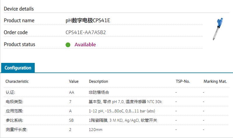 CPS41E-AA7ASB2 订货号 CPS41E-1020/0 扩展订货号 (CPS41E-AA7ASB2 ) 名称 pH数字电极CPS41E 基本描述 pH glass comb. sensor, Memosens 2.0.