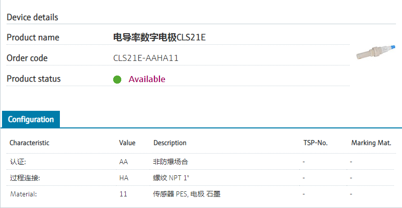 CLS21E-AAHA11 电导率传感器适用于地表水和饮用水监测; 电导率传感器适用于地表水和饮用水监测; 非防爆场合 连接; 螺纹 NTP 1'' 传感器 PES, 电极 石墨