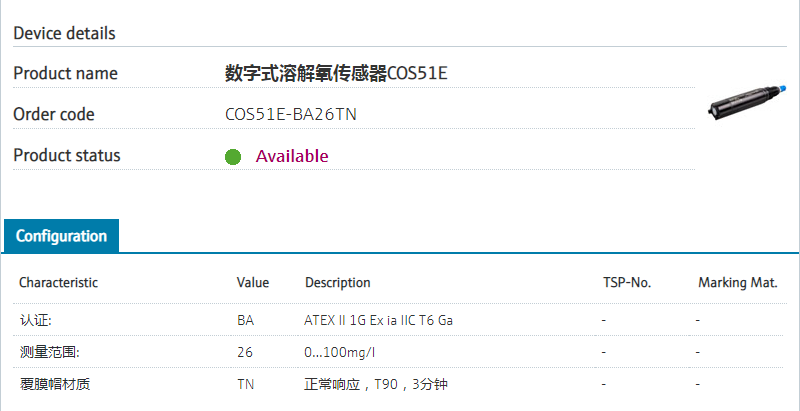 COS51E-BA26TN 订货号 COS51E-1098/0 扩展订货号 (COS51E-BA26TN) 名称 数字式溶解氧传感器COS51E 基本描述 Digital amperometric sensor for